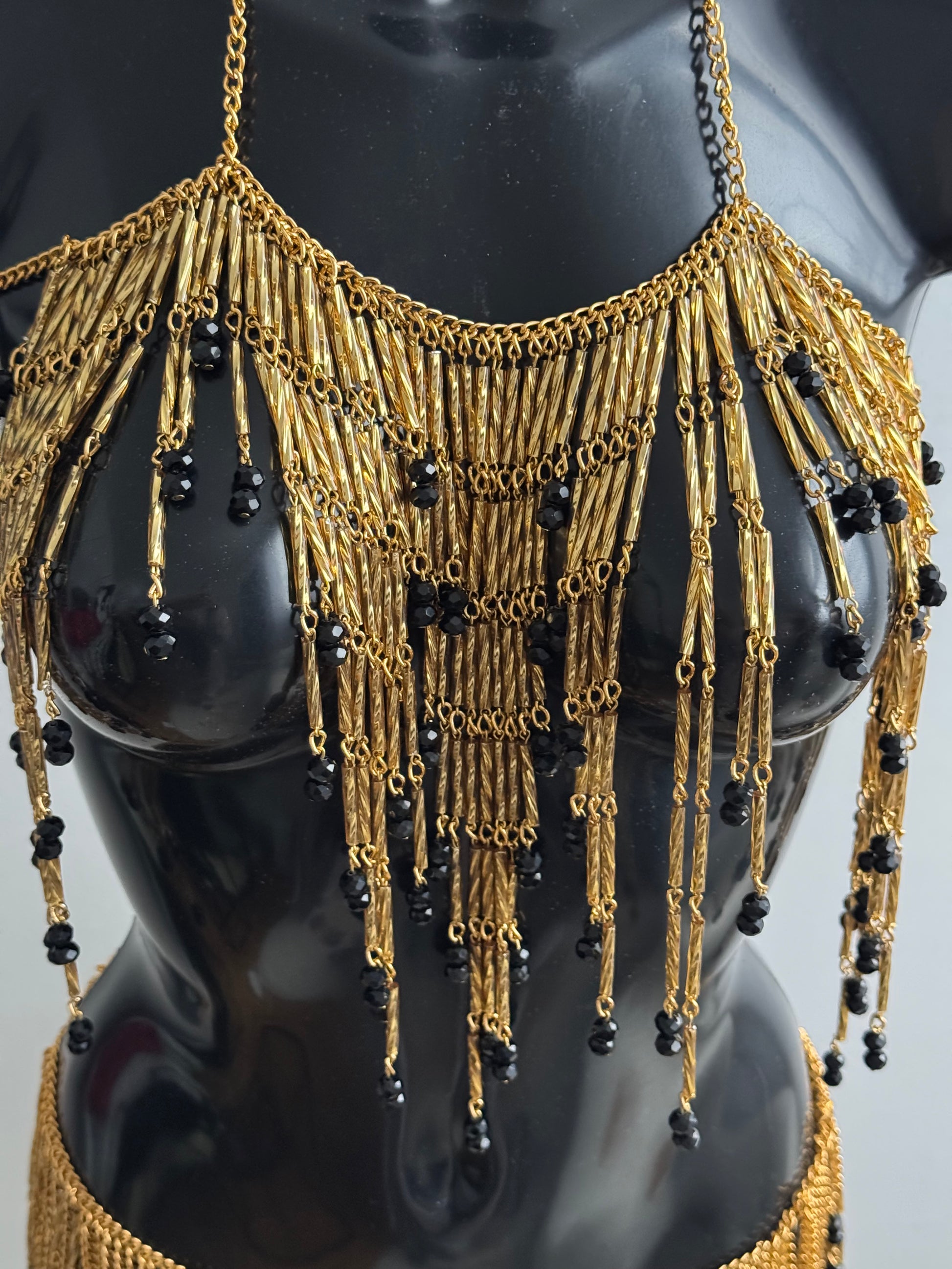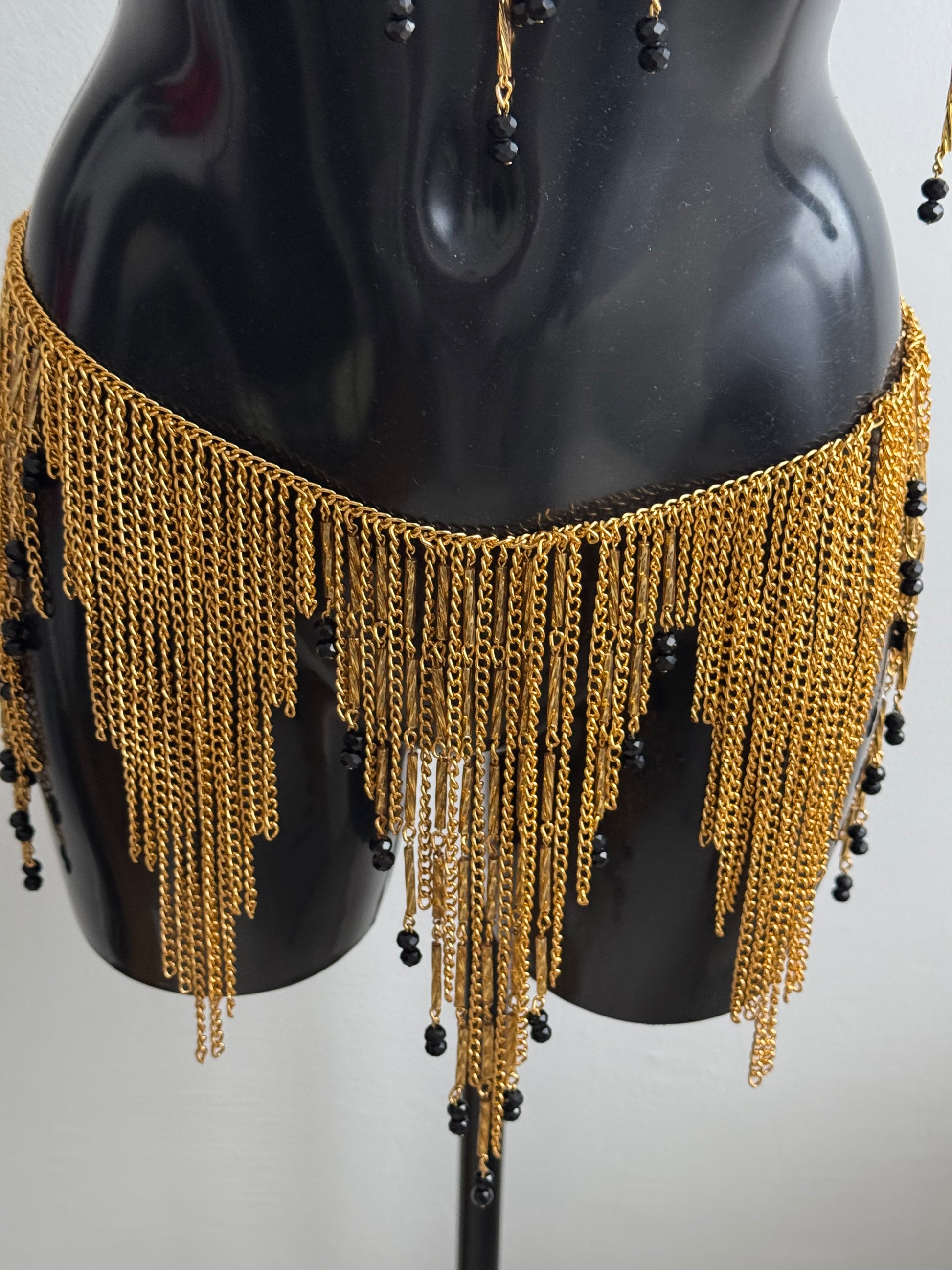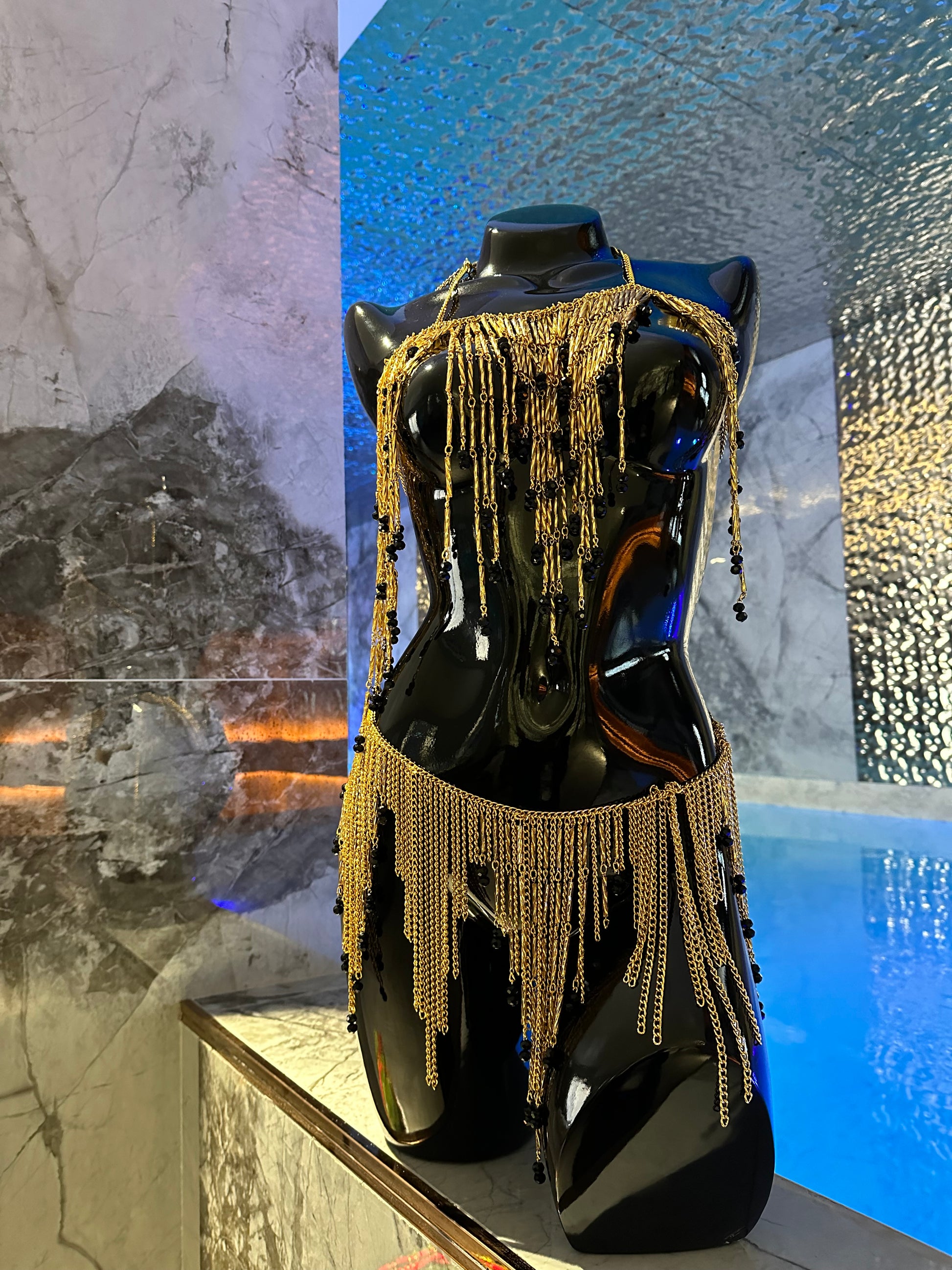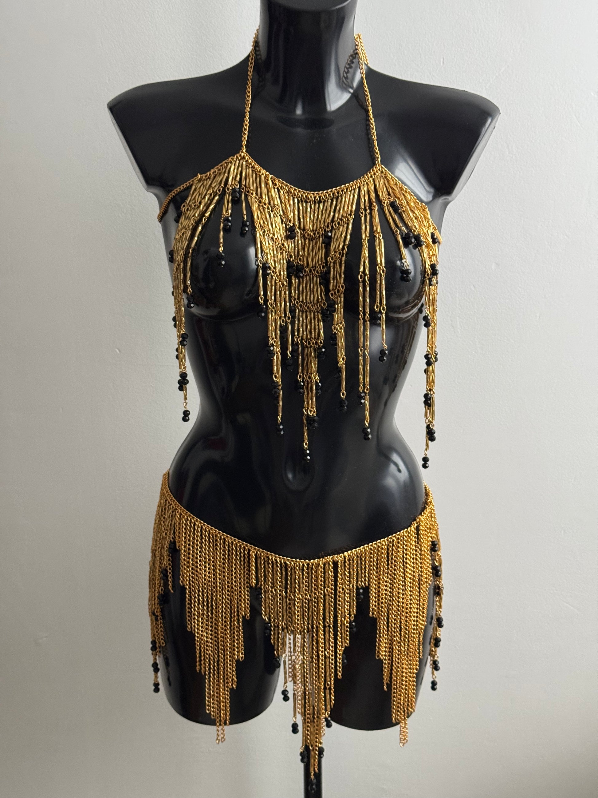 Ce modèle Désiré, confectionnée à la main avec des chaînes délicates et des perles raffinées, sublime la silhouette avec audace et sensualité. Ajustable pour épouser parfaitement vos courbes, chaque détail est conçu pour mettre en valeur vos atouts et révéler votre beauté unique. En enfilant cette pièce, vous vous sentirez véritablement irrésistible, prête à incarner le raffinement et le glamour.