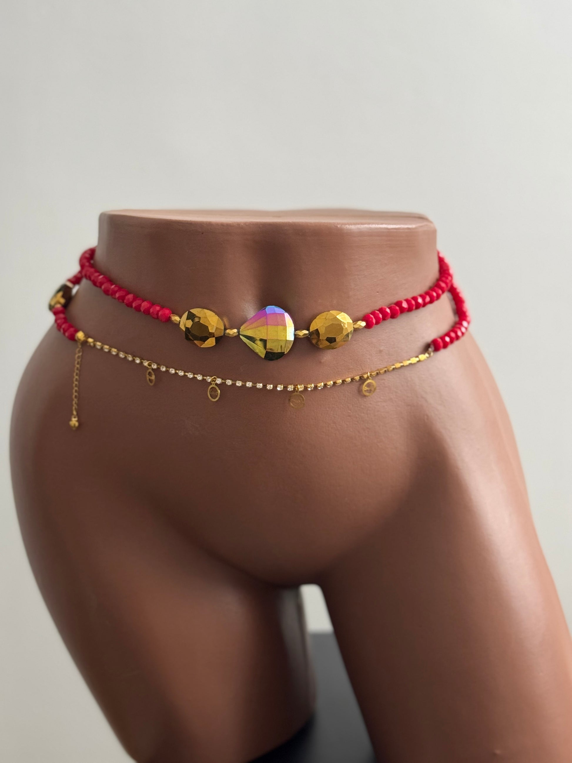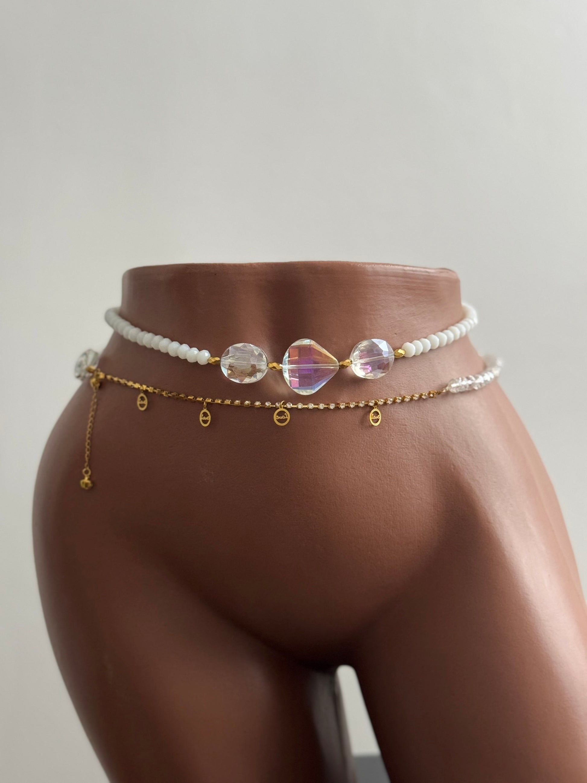 Découvrez le Double Baya Prestige, une pièce incontournable chez Lady Caviar. Composée de chaînes ornées de perles et de strass scintillants, accompagnée de trois diamants étincelants et d’une clochette délicate, elle incarne l’élégance, la sensualité et le raffinement.